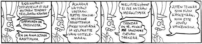 Vaikka edellä esitetty antaakin koulutuslaitoksestamme varsin negatiivisen kuvan, on siitä silti hyötyä. Koulumaailmassa voi olla mukana “näennäisenä sopeutujana” sekä kriitikkona ja näin käyttää sen antamia valmiuksia siihen mitä itse arvostaa. Opetus antaa siis kuitenkin välineitä vastustaa sitä itseään. Vastarintaa ja kriittisyyttä ei voi ikinä lopullisesti tukahduttaakaan.